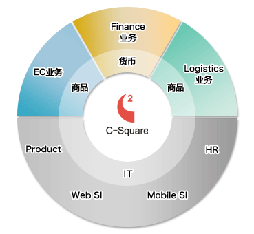 在这3间公司里,C-square已经建立了一个不仅仅是IT系统的创新机制。也在各公司里制定了对外承包系统,包括制作多种语言的网站,由制定国际频道开始,提供销售国际产品,物流服务及IT系统。