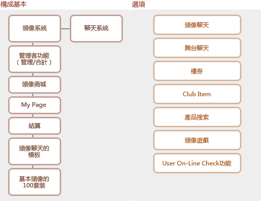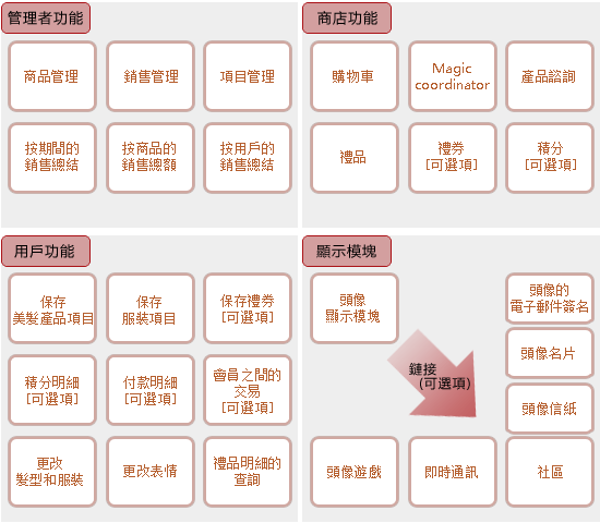 | 連動 表示 モジュール[Optional] | メールのAvatar署名 Avatar名刺 Avatar便箋 コミュニティ インスタントメッセンジャー Avatarゲーム | 署名にキャラクター表示 公開プロフィールにキャラクター表示 メール本文にキャラクター表示 掲示板、ブログ、チャットにキャラクター表示 メッセンジャーのメンバーリストや、メッセージウィンドウの所定の枠内にアバターを表示させることが可能 ゲーム画面の顔アイコン・対戦相手のキャラクターを表示 |