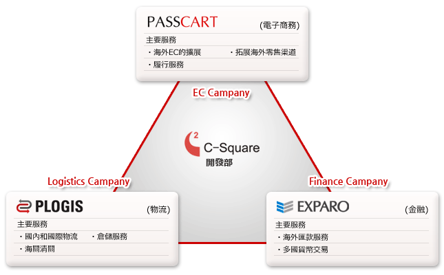 C-square以網站,手機的尖端技術服務作基礎,主軸於[系統開發]服務,並開發了3個不同的商務。包括「(EC)電子商務公司」,「物流公司」及「金融公司」。