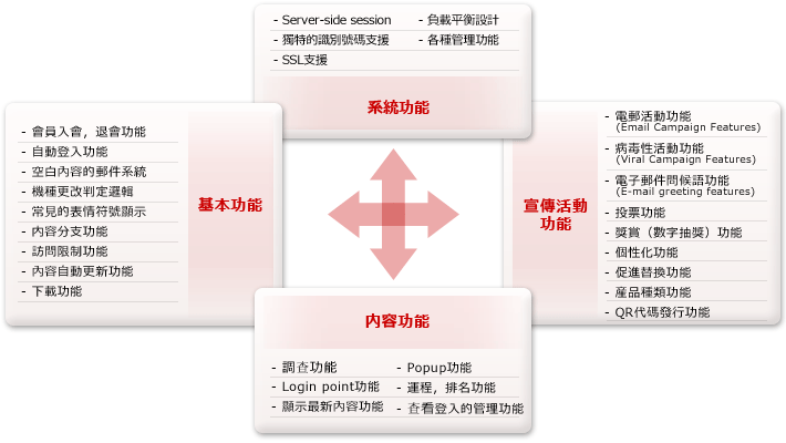 新內容顯示功能,訪問限制功能,分支內容功能,內容自動更新功能,下載功能,調査功能,運程,排名功能,查看登入的管理功能,個性化功能,Popup功能,獎賞(數字抽獎)功能,病毒性活動功能,電子郵件問候語功能,投票功能,查看日志管理,個性化的特點,功能彈出獎(批號),病毒性運動能力,電子郵件問候語的功能,投票功能,促進替換功能,Log point功能。