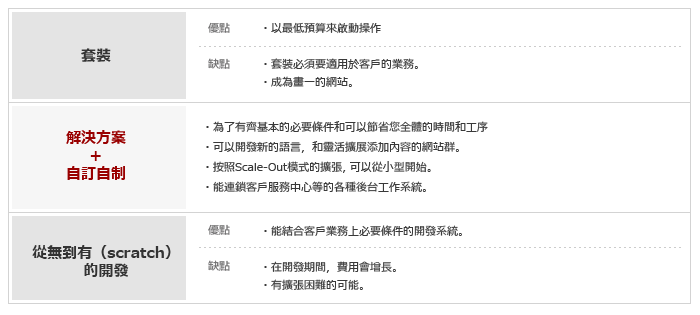 套裝軟件+自訂的開發系統,能在短時間內建設-個成本比較低的整體性全新系統。此外,從本公司過去所累積各種各様自訂開發的經驗,可彈性應對需要擴展的網站,包括開發新的語言和追加內容群組等。
